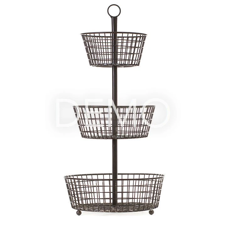Here's a three tiered wire basket to clean up your countertop and elevate your storage space. Display a selection of fresh fruit to encourage healthy snacking: pile it high and watch it fly. Can also be used as a caddy for dinner time fixings. Gather up a nice display of baked buns or cupcakes and usher them off to the table with the handy carry ring at the top.